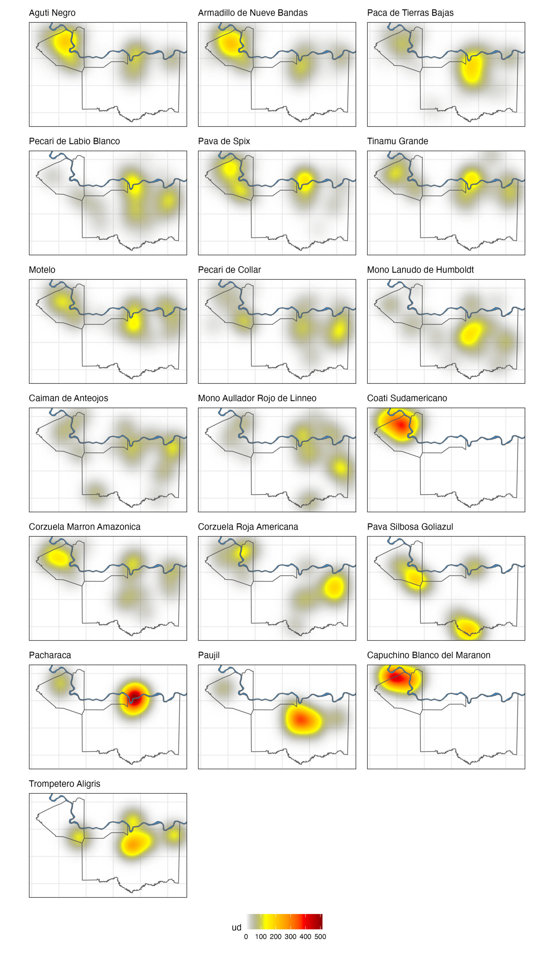 Con base en los registros espaciales de cada excursión de caza, se generaron mapas de calor (heatmaps) que muestran la distribución de los sitios donde fueron cazadas las distintas especies. Estos mapas permiten visualizar patrones espaciales de caza dentro del territorio, identificando áreas de mayor concentración de capturas y comparando la intensidad de caza entre especies. Esta aproximación facilita un entendimiento más claro de la relación entre las prácticas de caza, la disponibilidad de fauna y el uso del espacio por parte de los cazadores.