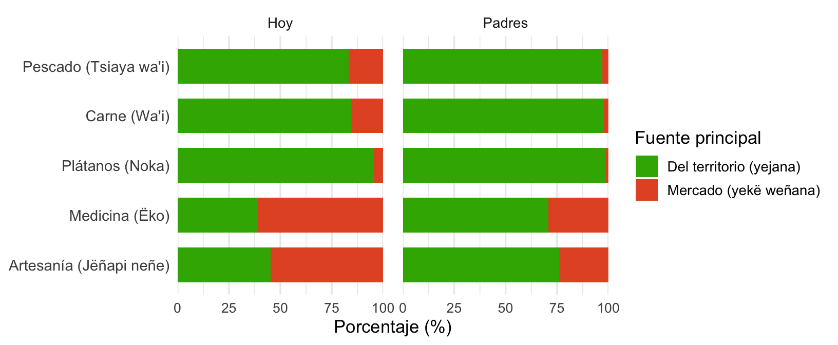 Alimentación y subsistencia: Fuentes de alimentos clave hoy y en generaciones pasadas, incluyendo pescado, carne, productos agrícolas y recursos del bosque.